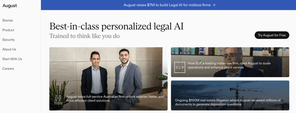 August is a configurable legal AI platform built to mimic and extend the expertise of law firms. It lets firms train the system on their own precedents, templates, and style so the AI works the way they do. The product enables automated drafting, clause generation, and document review workflows that scale the firm’s capabilities.